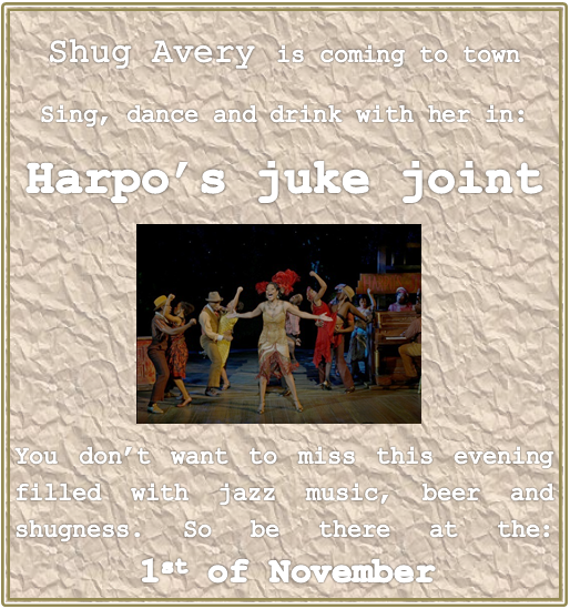 The assignment was to make a type of text: mass or professional communication. So I've chosen for an advertisement. Harpo's bar is never largely crowded, so he asked the jazzsinger Shug Avery to come and sing in his bar. So I've made this advertisement so that everyone in the town knows there is a jazzsinger coming to town. So that his bar would be more popular!